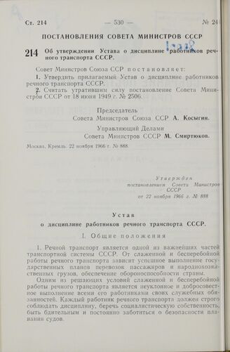 Постановление Совета министров СССР. Об утверждении Устава о дисциплине работников речного транспорта СССР. 22 ноября 1966 г. № 888
