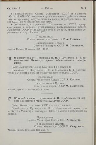 Постановление Совета Министров СССР. Об освобождении т. Кузнецова А. Н. от обязанностей первого заместителя Министра культуры СССР. 23 января 1967 г. № 46