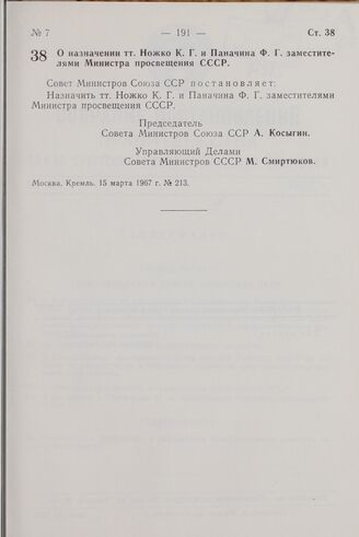 Постановление Совета Министров СССР. О назначении тт. Ножко К. Г. и Паначина Ф. Г. заместителями Министра просвещения СССР. 15 марта 1967 г. № 213