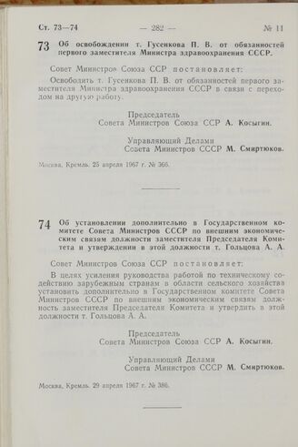 Постановление Совета Министров СССР. Об освобождении т. Гусенкова П. В. от обязанностей первого заместителя Министра здравоохранения СССР. 25 апреля 1967 г. № 366