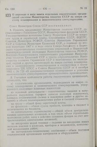 Постановление Совета Министров СССР. О переводе в виде опыта отдельных геологических организаций системы Министерства геологии СССР на новую систему планирования и экономического стимулирования. 14 июля 1967 г. № 656