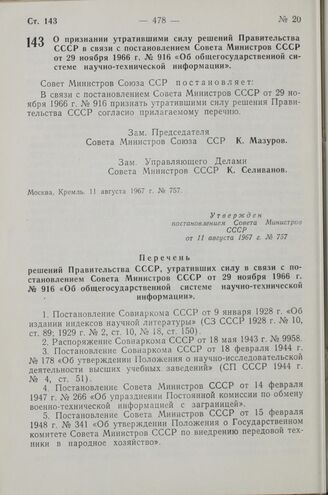 Постановление Совета Министров СССР. О признании утратившими силу решений Правительства СССР в связи с постановлением Совета Министров СССР от 29 ноября 1966 г. № 916 «Об общегосударственной системе научно-технической информации». 11 августа 1967 г. № 757