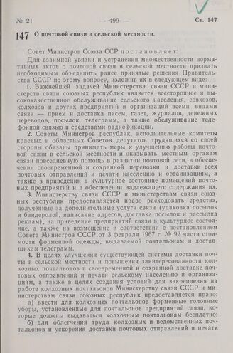 Постановление Совета Министров СССР. О почтовой связи в сельской местности. 15 августа 1967 г. № 788