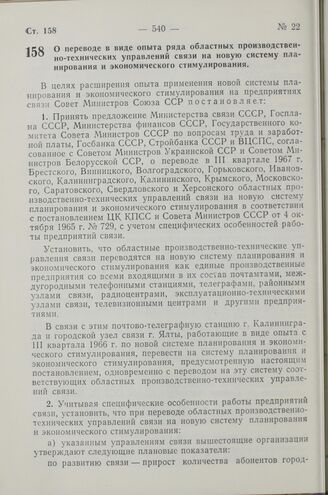 Постановление Совета Министров СССР. О переводе в виде опыта ряда областных производственно-технических управлений связи на новую систему планирования и экономического стимулирования. 31 августа 1967 г. № 826