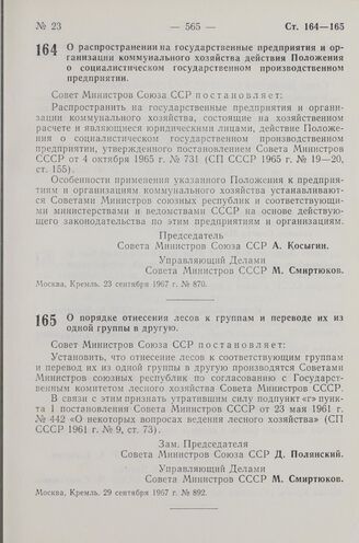 Постановление Совета Министров СССР. О распространении на государственные предприятия и организации коммунального хозяйства действия Положения о социалистическом государственном производственном предприятии. 23 сентября 1967 г. № 870
