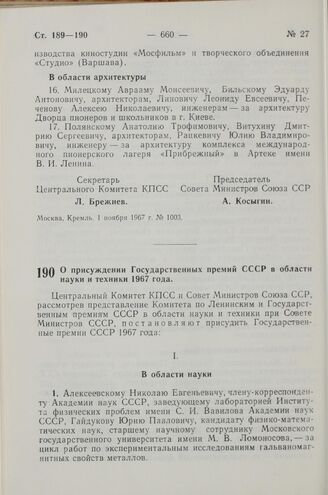 Постановление Центрального Комитета КПСС и Совета Министров СССР. О присуждении Государственных премий СССР в области науки и техники 1967 года. 3 ноября 1967 г. № 1013