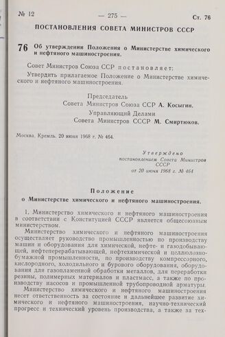 Постановление Совета Министров СССР. Об утверждении Положения о Министерстве химического и нефтяного машиностроения. 20 июня 1968 г. № 464