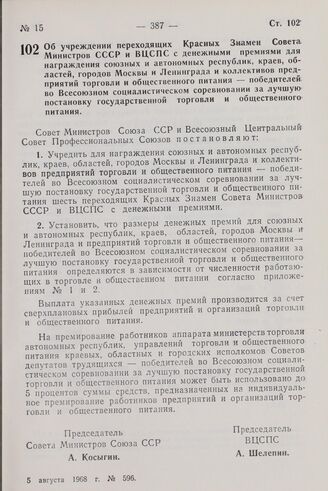 Постановление Центрального Комитета КПСС, Совета Министров СССР и Всесоюзного Центрального Совета Профессиональных Союзов. Об учреждении переходящих Красных Знамен Совета Министров СССР и ВЦСПС с денежными премиями для награждения союзных и автоно...