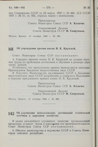 Постановление Совета Министров СССР. Об учреждении премии имени Н.К. Крупской. 15 октября 1968 г. № 806
