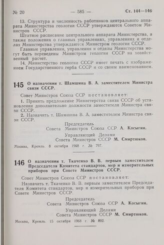 Постановление Совета Министров СССР. О назначении т. Ткаченко В.В. первым заместителем Председателя Комитета стандартов, мер и измерительных приборов при Совете Министров СССР. 15 октября 1968 г. № 802