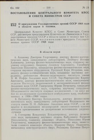 Постановление Центрального Комитета КПСС и Совета Министров СССР. О присуждении Государственных премий СССР 1968 года в области науки и техники. 5 ноября 1968 г. № 860