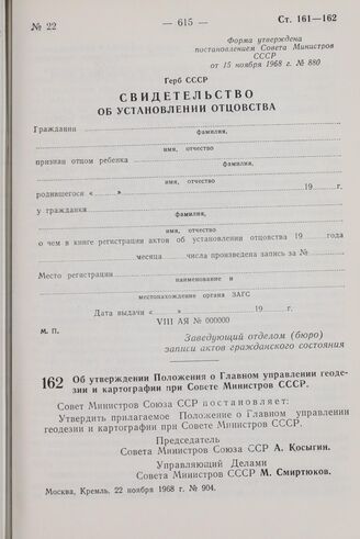 Постановление Совета Министров СССР. Об утверждении Положения о Главном управлении геодезии и картографии при Совете Министров СССР. 22 ноября 1968 г. № 904
