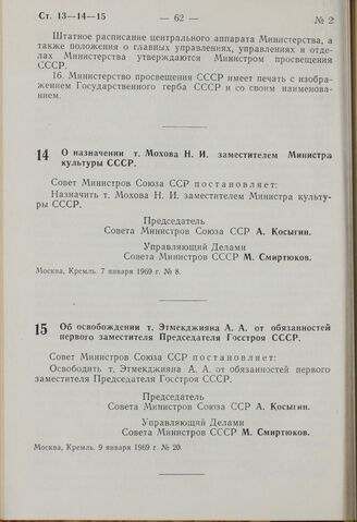 Постановление Совета Министров СССР. Об освобождении т. Этмекджияна А.А. от обязанностей первого заместителя Председателя Госстроя СССР. 9 января 1969 г. № 20
