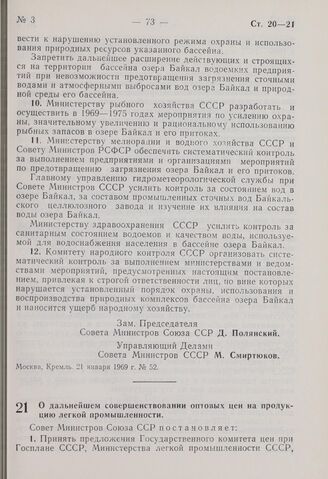 Постановление Совета Министров СССР. О дальнейшем совершенствовании оптовых цен на продукцию легкой промышленности. 24 января 1969 г. № 69