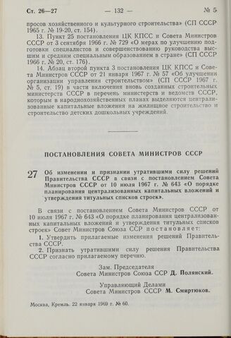 Постановление Совета Министров СССР. Об изменении и признании утратившими силу решений Правительства СССР в связи с постановлением Совета Министров СССР от 10 июля 1967 г. № 643 «О порядке планирования централизованных капитальных вложений и утверждения титульных списков строек». 22 января 1969 г. № 60