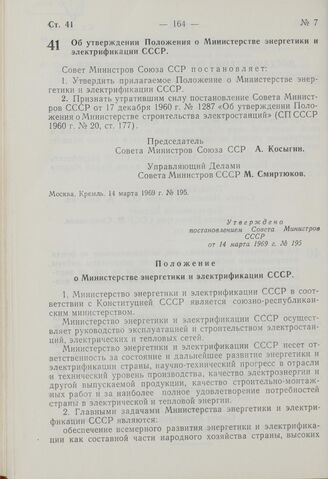 Постановление Совета Министров СССР. Об утверждении Положения о Министерстве энергетики и электрификации СССР. 14 марта 1969 г. № 195