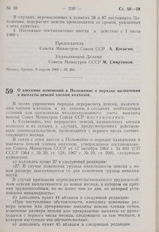 Постановление Совета Министров СССР. О внесении изменений в Положение о порядке назначения и выплаты пенсий членам колхозов. 9 апреля 1969 г. № 264