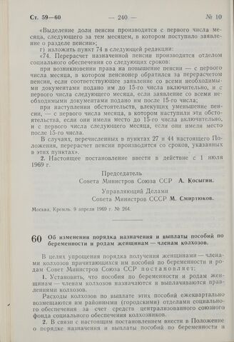 Постановление Совета Министров СССР. Об изменении порядка назначения и выплаты пособий по беременности и родам женщинам — членам колхозов. 9 апреля 1969 г. № 265
