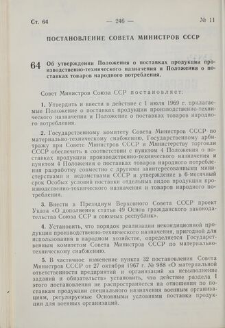 Постановление Совета Министров СССР. Об утверждении Положения о поставках продукции производственно-технического назначения и Положения о поставках товаров народного потребления. 9 апреля 1969 г. № 269