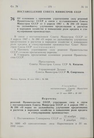 Постановление Совета Министров СССР. Об изменении и признании утратившими силу решений Правительства СССР в связи с постановлением Совета Министров СССР от 3 апреля 1967 г. № 280 «О мерах по дальнейшему улучшению кредитования и расчетов в народном хозяйстве и повышению роли кредита в стимулировании производства». 21 мая 1969 г. № 368