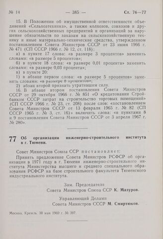 Постановление Совета Министров СССР. Об организации инженерно-строительного института в г. Тюмени. 30 мая 1969 г. № 397