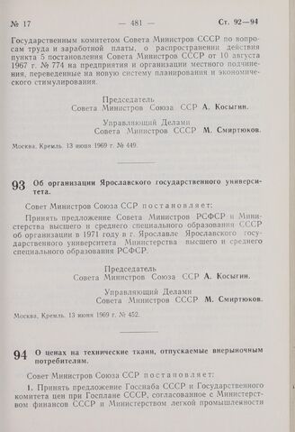 Постановление Совета Министров СССР. О ценах на технические ткани, отпускаемые внерыночным потребителям. 13 июня 1969 г. № 453