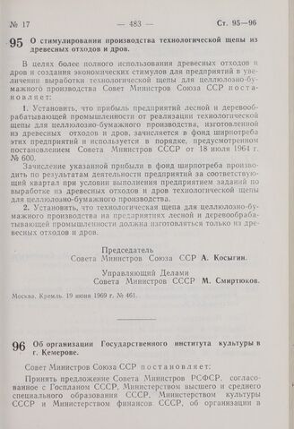 Постановление Совета Министров СССР. О стимулировании производства технологической щепы из древесных отходов и дров. 19 июня 1969 г. № 461