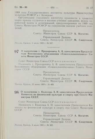 Постановление Совета Министров СССР. О назначении т. Колесова А.И. заместителем Председателя Комитета по физической культуре и спорту при Совете Министров СССР. 4 июля 1969 г. № 503