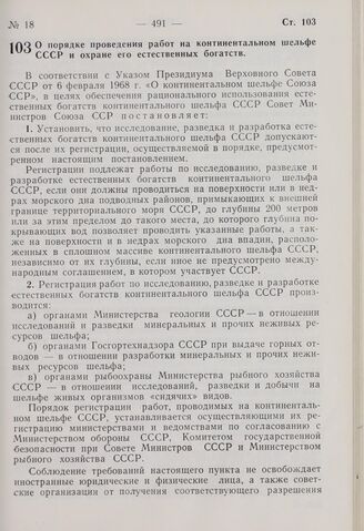 Постановление Совета Министров СССР. О порядке проведения работ на континентальном шельфе СССР и охране его естественных богатств. 18 июля 1969 г. № 564