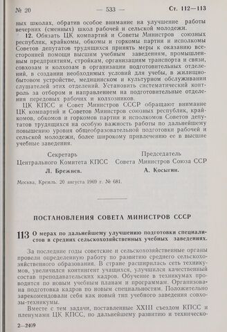Постановление Совета Министров СССР. О мерах по дальнейшему улучшению подготовки специалистов в средних сельскохозяйственных учебных заведениях. 14 августа 1969 г. № 658