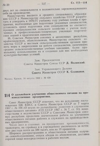Постановление Совета Министров СССР. О дальнейшем улучшении общественного питания на производственных предприятиях. 14 августа 1969 г. № 660