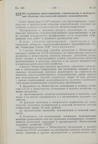 Постановление Совета Министров СССР. Об улучшении проектирования, строительства и эксплуатации объектов сельскохозяйственного водоснабжения. 11 сентября 1969 г. № 744