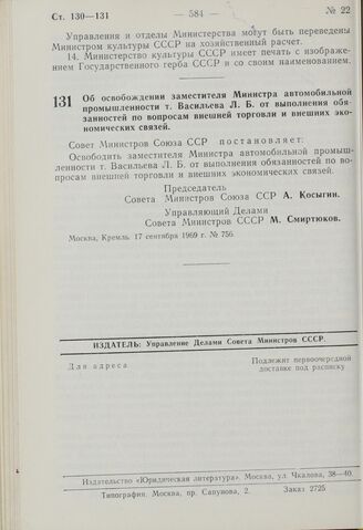 Постановление Совета Министров СССР. Об освобождении заместителя Министра автомобильной промышленности т. Васильева Л.Б. от выполнения обязанностей по вопросам внешней торговли и внешних экономических связей. 17 сентября 1969 г. № 756