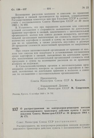 Постановление Совета Министров СССР. О распространении на контролеров-ревизоров поездов железнодорожного транспорта действия пункта 1 постановления Совета Министров СССР от 26 февраля 1964 г. № 175. 6 октября 1969 г. № 793