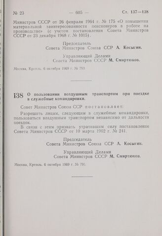 Постановление Совета Министров СССР. О пользовании воздушным транспортом при поездке в служебные командировки. 6 октября 1969 г. № 795