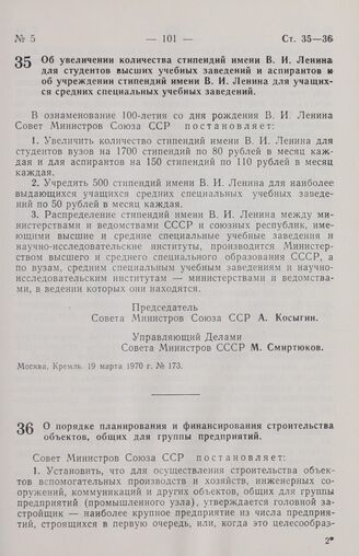 Постановление Совета министров СССР. О порядке планирования и финансирования строительства объектов, общих для группы предприятий. 19 марта 1970 г. № 177
