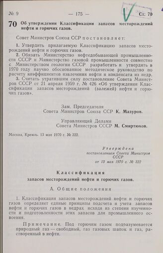 Постановление Совета министров СССР. Об утверждении Классификации запасов месторождений нефти и горючих газов. 13 мая 1970 г. № 322