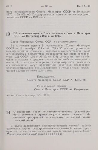 Постановление Совета Министров СССР. Об изменении пункта 2 постановления Совета Министров СССР от 18 сентября 1959 г. № 1099. 14 января 1971 г. № 23