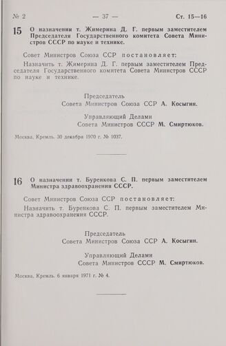 Постановление Совета Министров СССР. О назначении т. Жимерина Д. Г. первым заместителем Председателя Государственного комитета Совета Министров СССР по науке и технике. 30 декабря 1970 г. № 1037