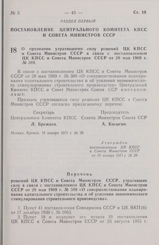 Постановление Центрального Комитета КПСС и Совета Министров СССР. О признании утратившими силу решений ЦК КПСС и Совета Министров СССР в связи с постановлением ЦК КПСС и Совета Министров СССР от 28 мая 1969 г. № 389. 19 января 1971 г. № 39