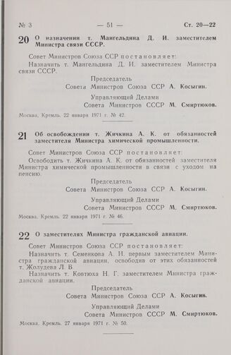Постановление Совета Министров СССР. О заместителях Министра гражданской авиации. 27 января 1971 г. № 50