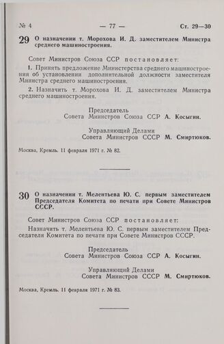 Постановление Совета Министров СССР. О назначении т. Мелентьева Ю. С. первым заместителем Председателя Комитета по печати при Совете Министров СССР. 11 февраля 1971 г. № 83