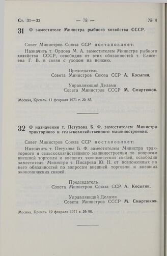 Постановление Совета Министров СССР. О заместителе Министра рыбного хозяйства СССР. 11 февраля 1971 г. № 85