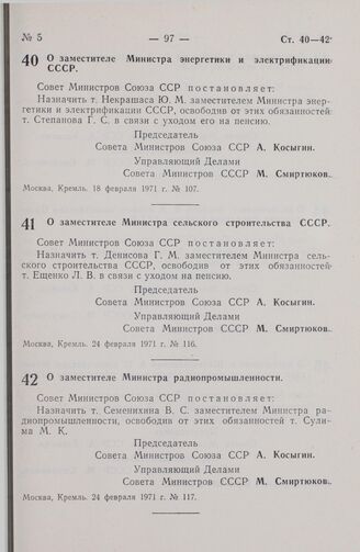 Постановление Совета Министров СССР. О заместителе Министра энергетики и электрификации СССР. 18 февраля 1971 г. № 107