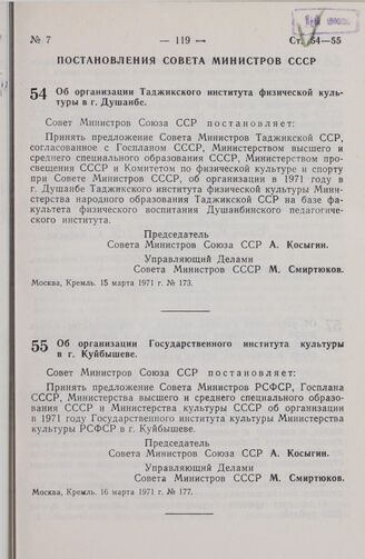 Постановление Совета Министров СССР. Об организации Государственного института культуры в г. Куйбышеве. 16 марта 1971 г. № 177