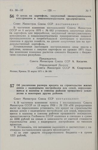 Главная Собрание законов и распоряжений правительства РСФСР и СССР Собрание законов и распоряжений Рабоче-Крестьянского Правительства ... Собрание постановлений правительства СССР за 1971 г. № 1-20 Документы Постановление Совета Министров СССР. О ценах на картофель, закупаем...
