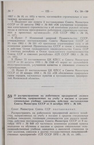 Постановление Совета Министров СССР. О распространении на работников предприятий лесного хозяйства, направляемых на учебу в высшие и средние специальные учебные заведения, действия постановления Совета Министров СССР от 9 октября 1970 г. № 848. 12...