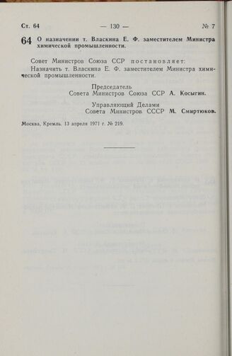 Постановление Совета Министров СССР. О назначении т. Власкина Е. Ф. заместителем Министра химической промышленности. 13 апреля 1971 г. № 219
