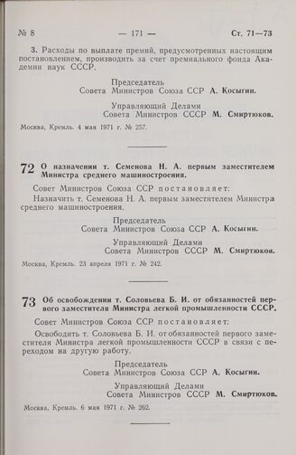 Постановление Совета Министров СССР. О назначении т. Семенова Н. А. первым заместителем Министра среднего машиностроения. 23 апреля 1971 г. № 242