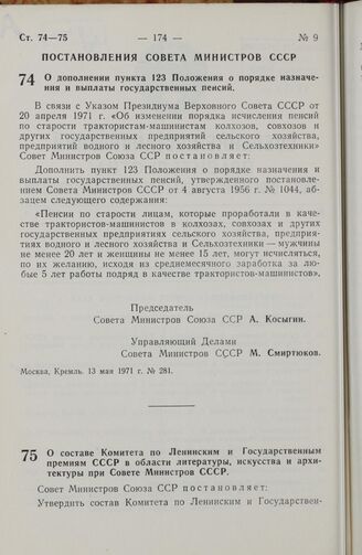 Главная Собрание законов и распоряжений правительства РСФСР и СССР Собрание законов и распоряжений Рабоче-Крестьянского Правительства ... Собрание постановлений правительства СССР за 1971 г. № 1-20 Документы Постановление Совета Министров СССР. О составе Комитета по Ленински...